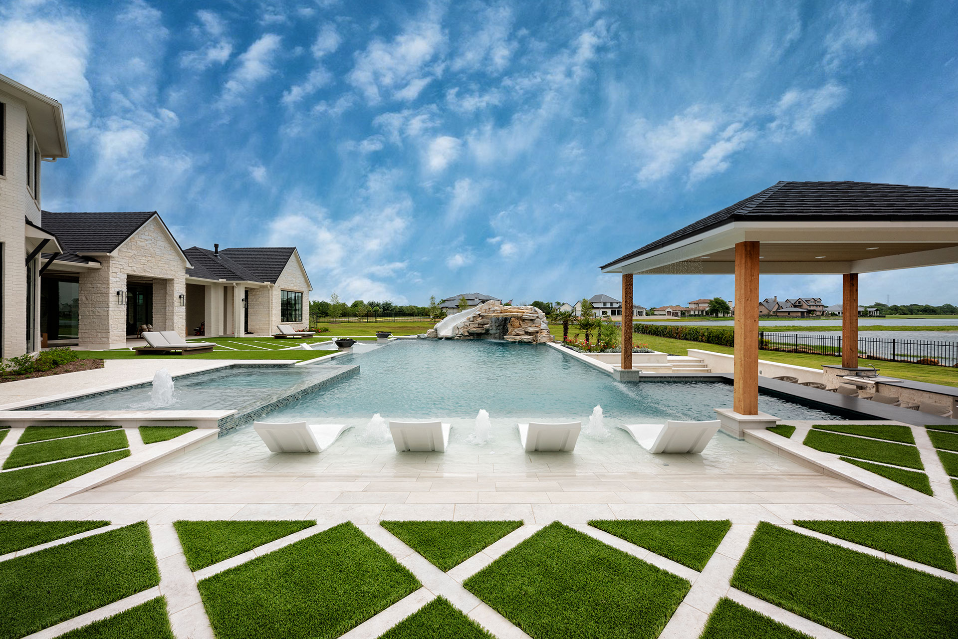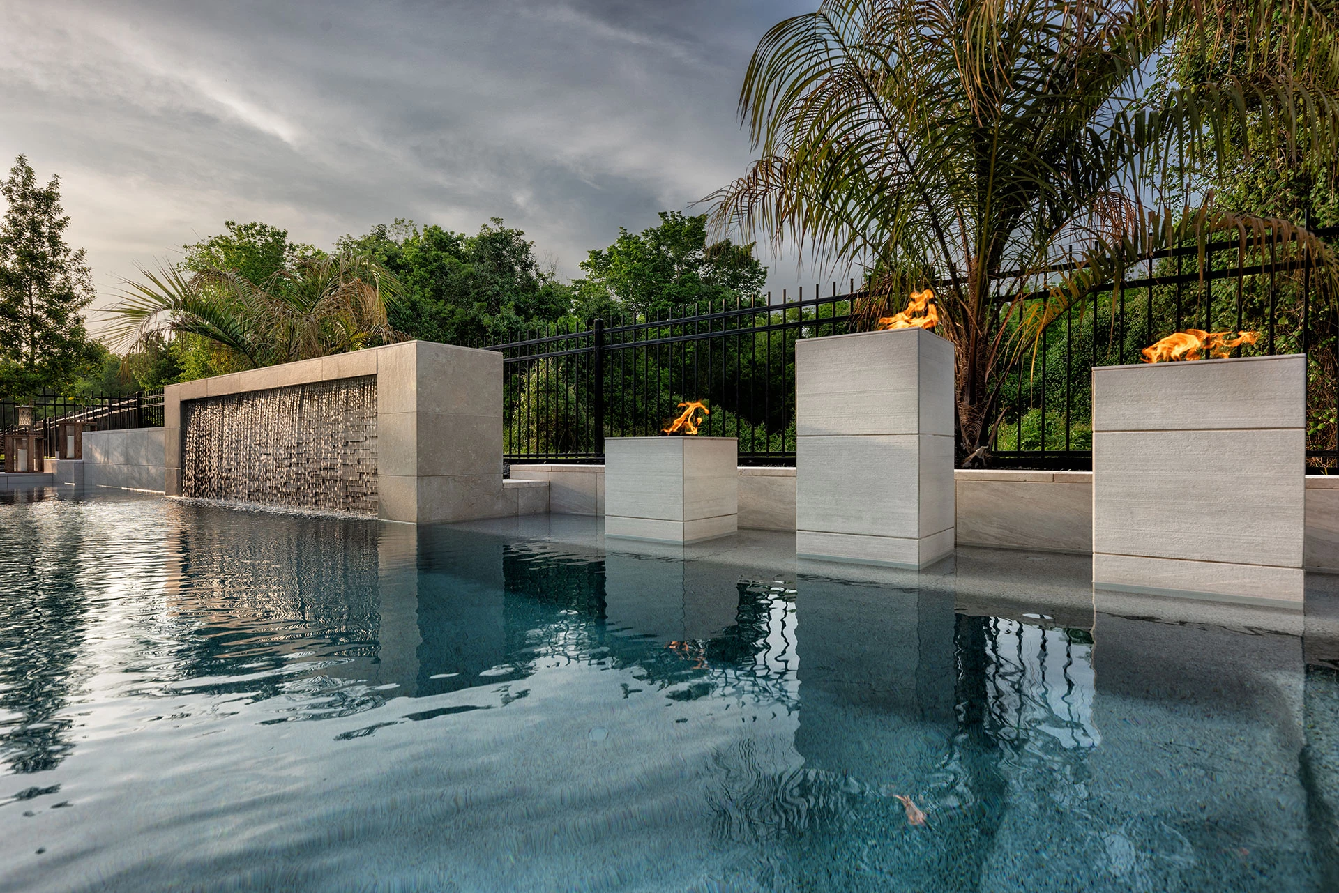 A luxury pool featuring cascading waterfalls, fire bowls, integrated seating, and a pavilion-style outdoor living space designed for entertaining.