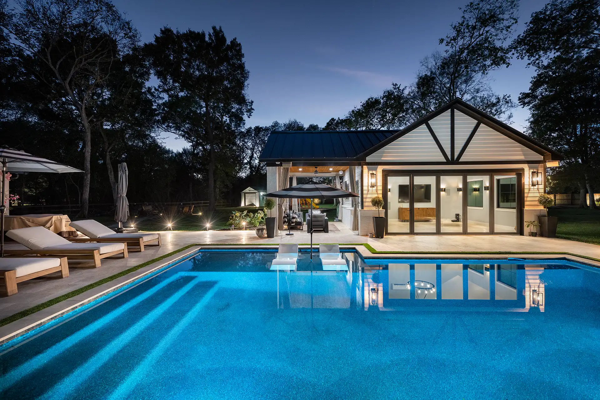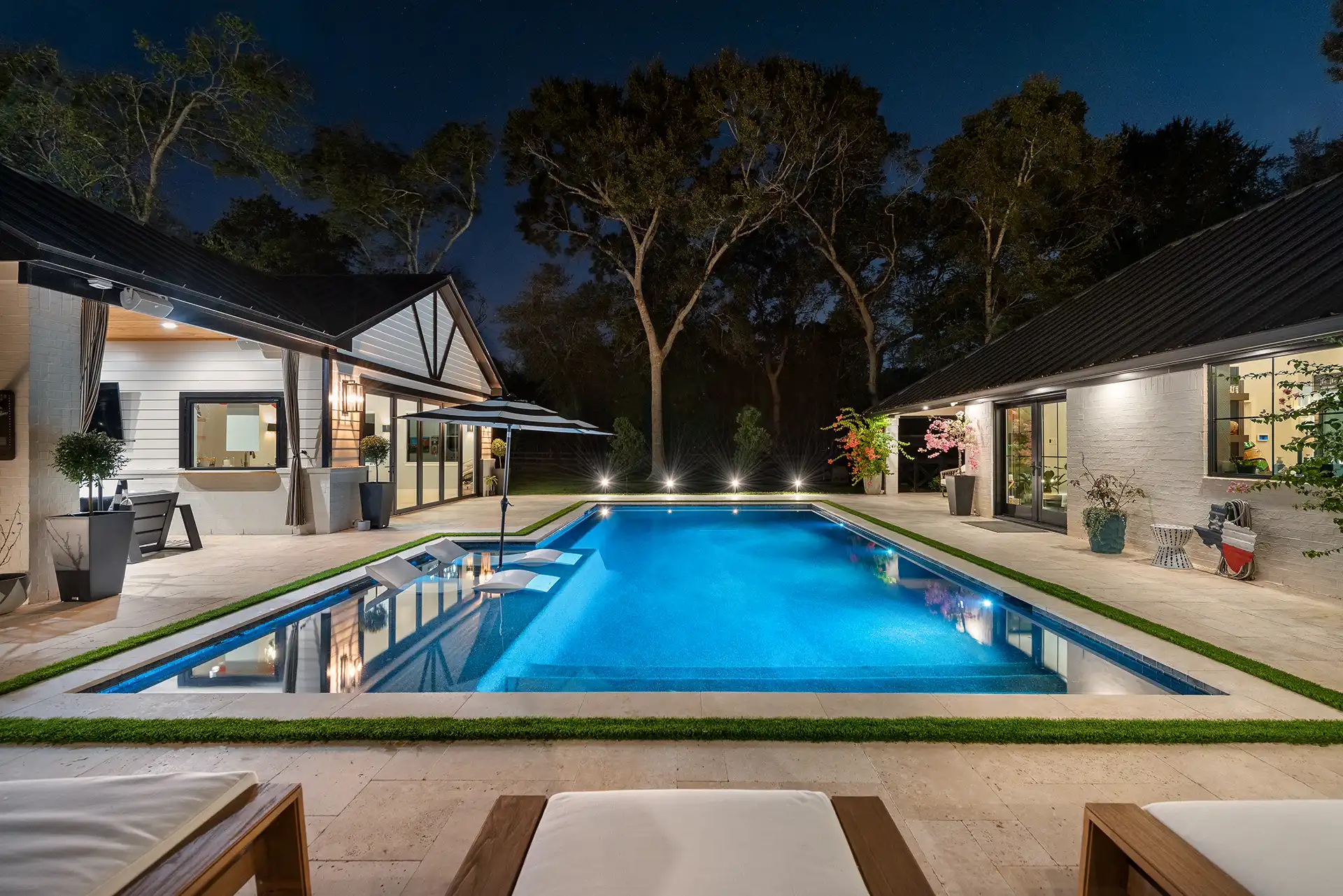 A refined architectural pool showcasing clean lines, premium finishes, integrated lounging areas, and ambient nighttime lighting.